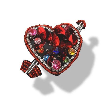 applicazione interamente composta da pietre in vetro, corallini e paillettes cucite a mano a forma di cuore con freccia 5,5 cm x