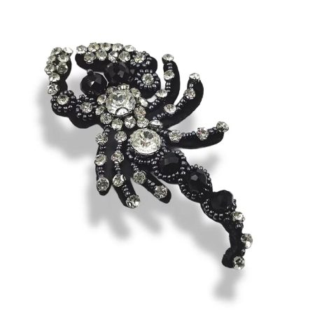 applicazione interamente composta da pietre in vetro e corallini cuciti a mano a forma di scorpione 5,5 cm x 10 cm.