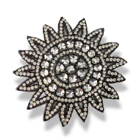 applicazione interamente cucita a macchina, raffigurante un sole, pietre e corallini sono ricamati su tessuto di tulle 15,5 cm x