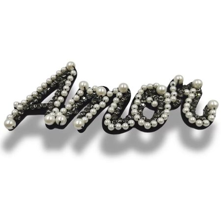 applicazione interamente composta da pietre in vetro e perle cucite a mano a forma di scritta amor 7 cm x 15 cm.