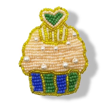 applicazione interamente cucita a mano, raffigurante una coppetta di gelato, realizzata con file di corallini e perline 5 cm x 6