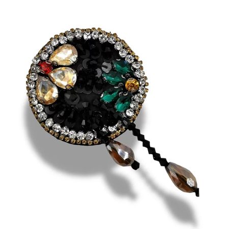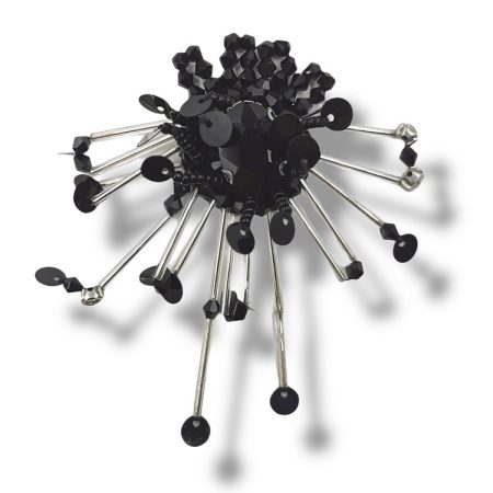 applicazione pendente interamente composta da canottiglie, corallini, paillettes e pietra nera centrale in vetro 2,5 cm x 2,5 cm