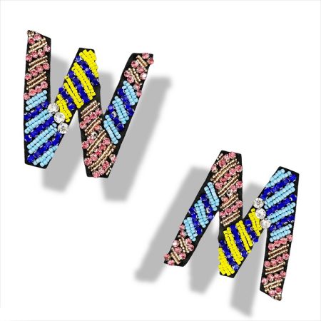 applicazione raffigurante la lettera ” m ” o ” w ” , realizzata con file di corallini e pietre colorate 8,5 cm x 7,5 cm