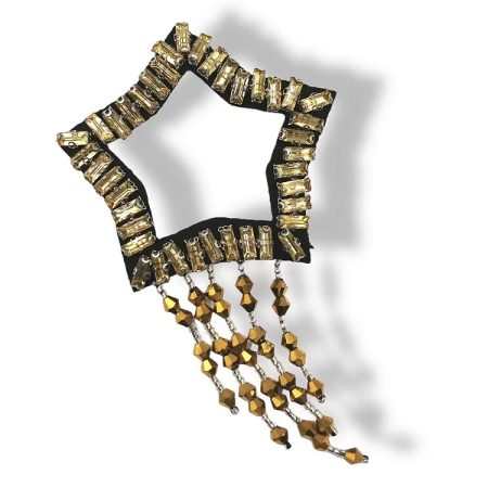 applicazione pendente a forma di stella interamente composta da baguettes acriliche e corallini, tutto cucito a mano 6,4 cm x 5,