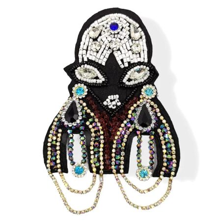 applicazione raffigurante il volto di donna, realizzata con perline, pietre, corallini e catene di strass pendenti 16 cm x 6 cm