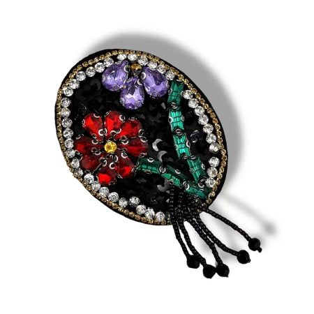 applicazione pendente interamente composta da pietre in vetro, paillettes e corallini, tutto cucito a mano 6,5 cm x 8,2 cm