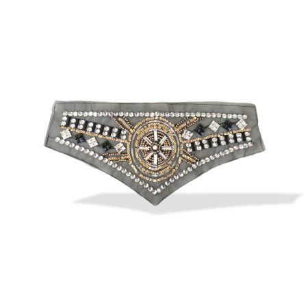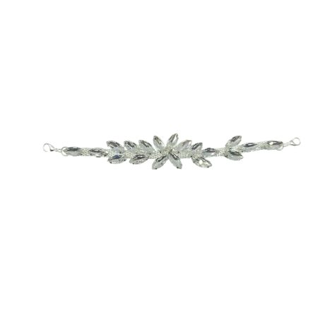 applicazione cucita interamente a macchina, raffigurante una foglia realizzata con pietre di vetro colorato e una catena di stra