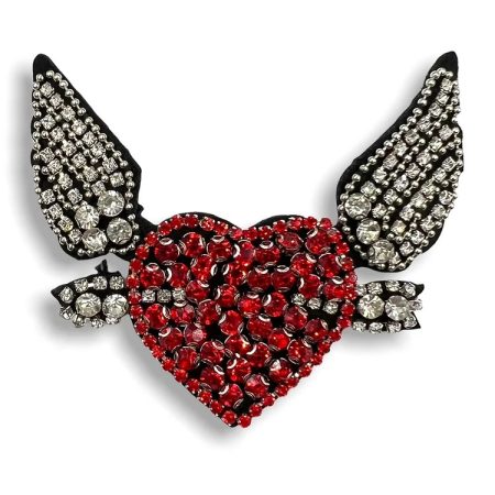 applicazione cuore con ali realizzato con pietre in vetro e microsfere, tutto cucito a mano h:7.5 cm x 6 cm