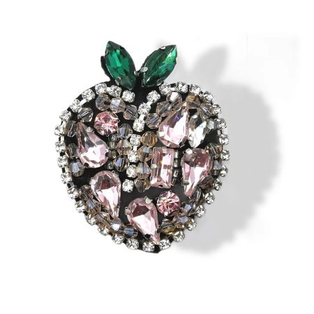 applicazione cucita interamente a macchina, raffigurante un frutto, realizzato con pietre di vetro colorato e una catena di stra