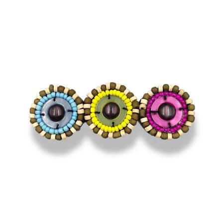applicazione con tre pietre centrali racchiuse da un inserto in plastica e contornate da due file di corallini che ne delineano