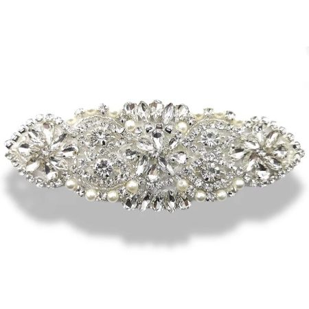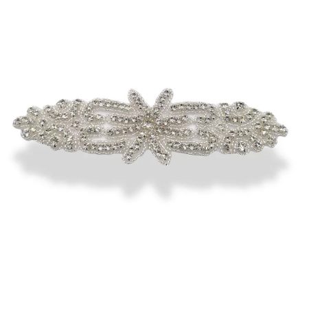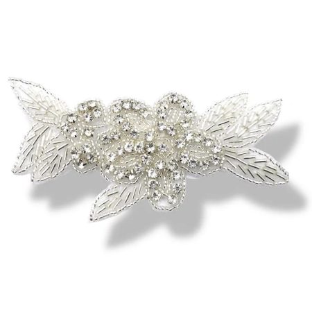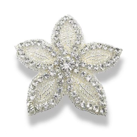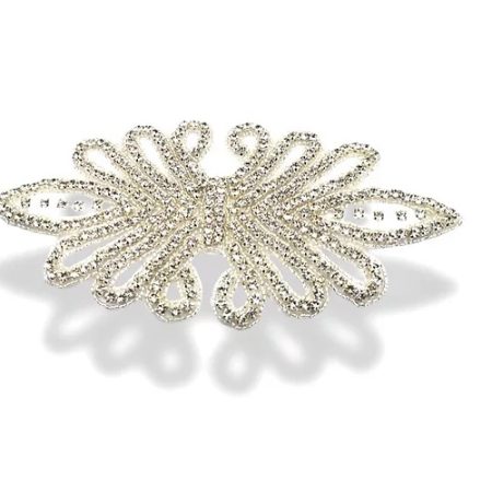 applicazione termoadesiva a forma di fiore interamente composta da file di strass, canottiglie e perline 12 cm x 5,5 cm