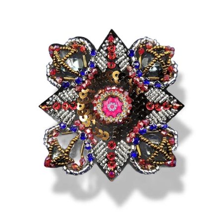 applicazione termoadesiva a forma di rosa dei venti composta da corallini, paillettes, canottiglie e pietre in vetro cucite a ma