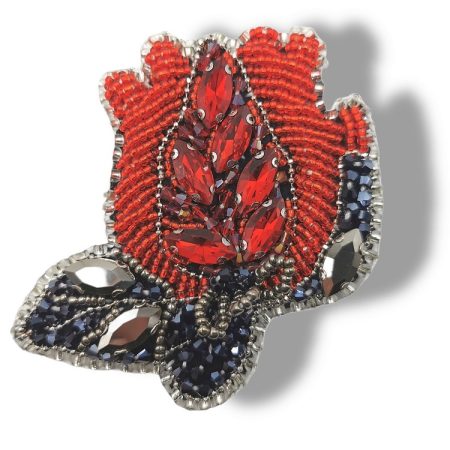 applicazione termoadesiva a forma di rosa interamente composta da pietre in vetro, corallini e microsfere cucite a mano 8,3 cm x
