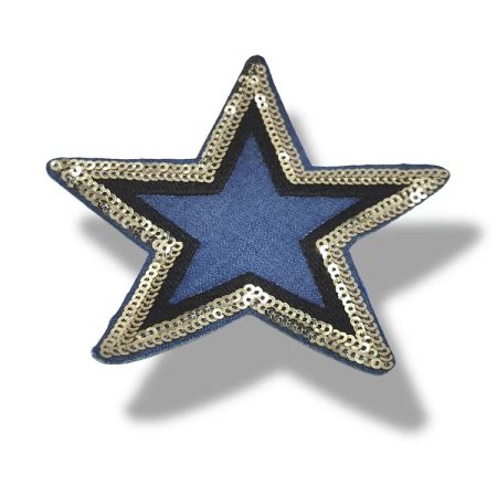 applicazione termoadesiva a forma di stella interamente composta da tessuto e paillettes cucite a mano 10 cm x 10 cm.