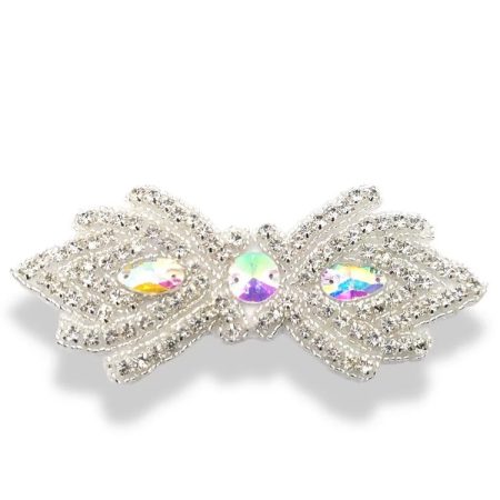 applicazione termoadesiva a forma di fiocco interamente composta file di strass e n 3 pietre in ab crystal in posizione centra