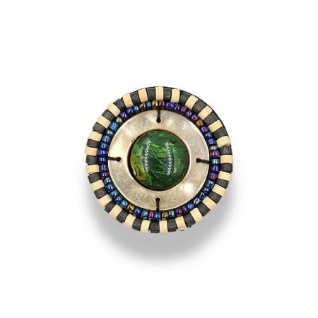 applicazione con pietra centrale sfacciettata, perline, pietre e strass incollate su base panno lenci 9 cm x 8 cm