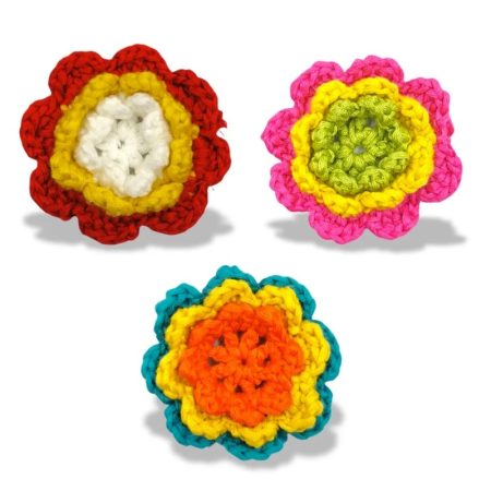 applicazione raffigurante un fiore con petali, realizzata interamente ad uncinetto, con fili di lana circonferenza di 75 mm