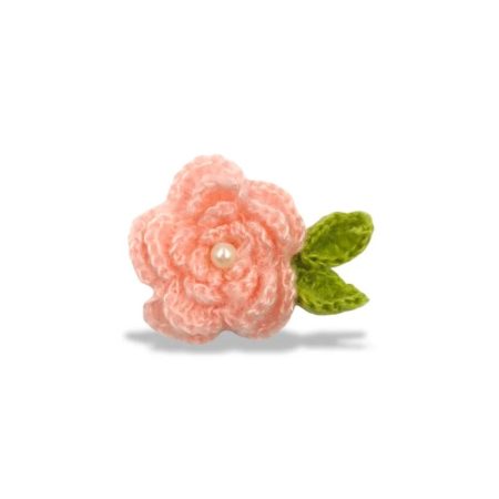 applicazione raffigurante un fiore con petali, realizzata con lana d’angora ad uncinetto e con una perla, posizionata al centro