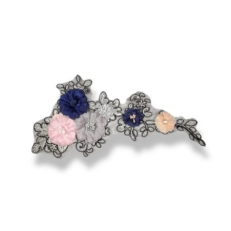 applicazione termoadesiva a tema floreale, patchgrande interamente ricamata a macchina su tessuto d’organza e con fiori applicat