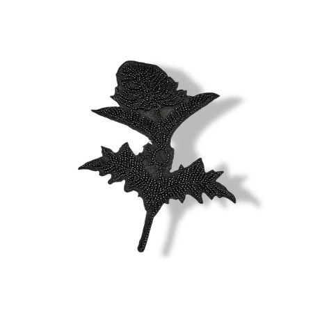 applicazione termoadesiva raffigurante un fiore con stelo e foglie,patchgrande realizzata interamente con file di corallini neri