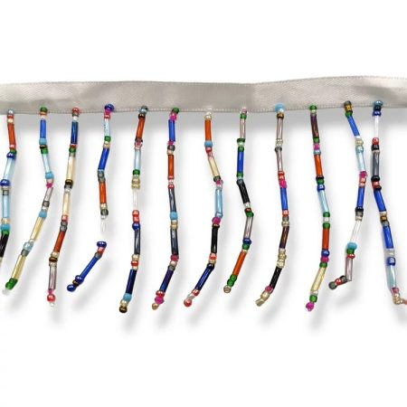 passamaneria bianca e frange pendenti composte da file di corallini multicolor h 6,5 cm , bandina 1 cm e pendenti da 5,5 cm