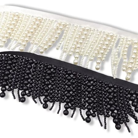 passamaneria con una base di raso, con file di perle e perline, che fungono da frange h totale 85 mm : raso da 10 mm , perline d