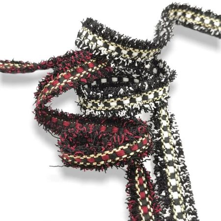 passamaneria realizzata centralmente con inserti in filo lurex oro e argento, mentre lateralmente con frange colorate mm 15