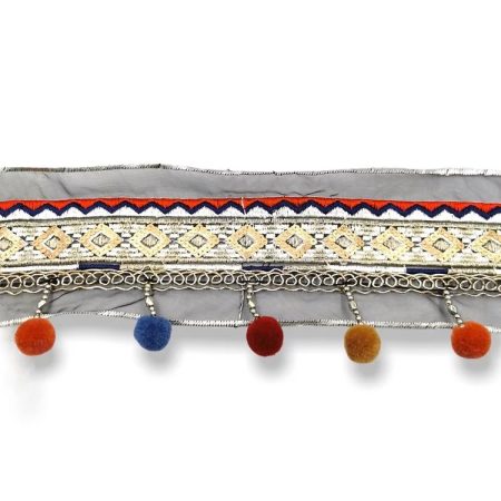passamaneria etnica, bandina ricamata con motivi geometrici e pendenti a forma di nappine h totale : 80 mm, h bandina 40 mm e h