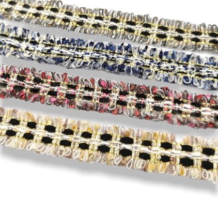 passamaneria in stile scozzese realizzata centralmente con inserti in filo lurex oro e lateralmente con frange colorate mm 25