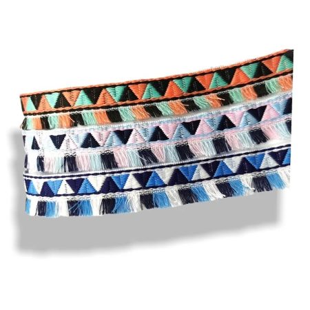passamaneria in stile etnico, realizzata con una bandina ricamata e frange pendenti mm 20