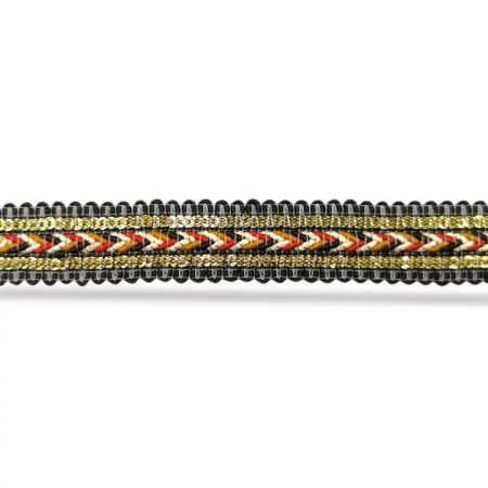 passamaneria in stile etnico, realizzata con ricamo centrale adornato lateralmente da due catene di paillettes gold 20 mm