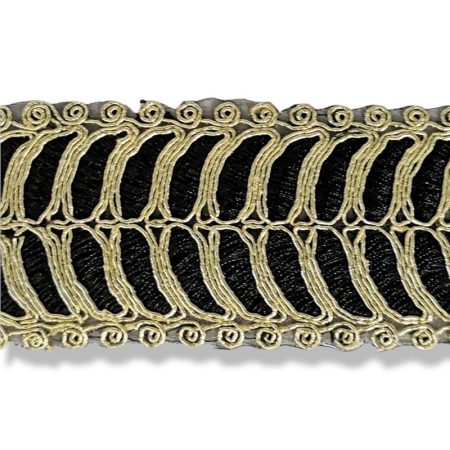 passamaneria in tema etnico, realizzata con inserti in filo lurex oro, che adornano la base in tulle nero mm 55