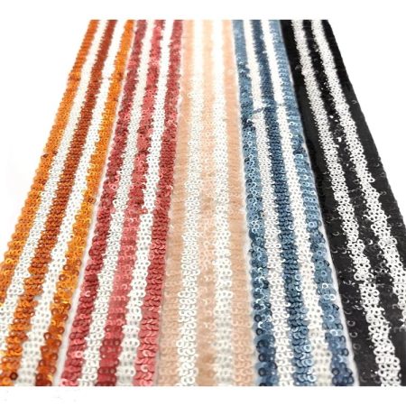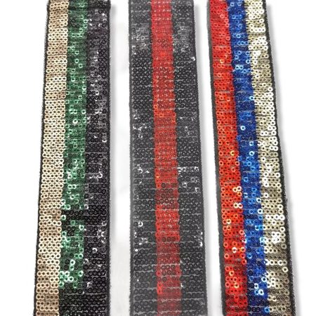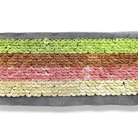 passamaneria realizzata con paillettes lucide colorate disposte su tre file orizzontali mm 40