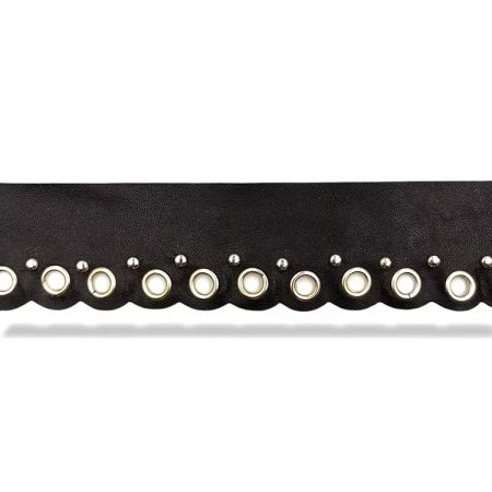 passamaneria realizzata in eco-pelle nera con occhielli in metallo e borchie tonde silver a griffe mm 42