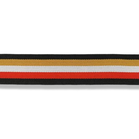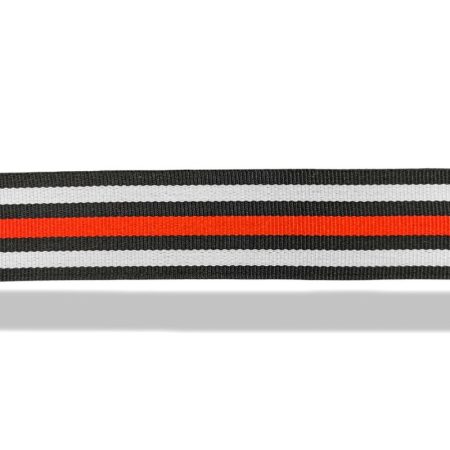 passamaneria realizzata in gros grain a righe orizzontali, la centrale È rossa e lateralmente sono alternate righe nere e grigie