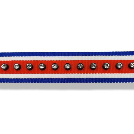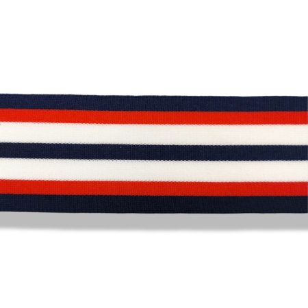 passamaneria realizzata in gros grain a linee orizzontali, con linea centrale blue e laterali bianche, rosse e blue mm 40