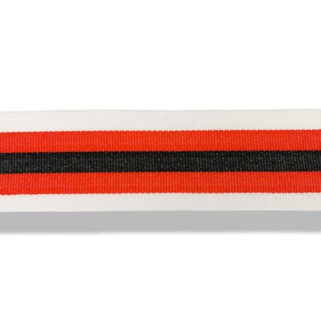 passamaneria realizzata in gros grain a linee orizzontali, con linea centrale nera e lateralmente linee rosse e bianche mm 40