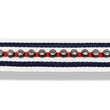 passamaneria realizzata in gros grain a righe orizzontali e centralmente vi sono applicati strass con ghiera termosaldata, dispo