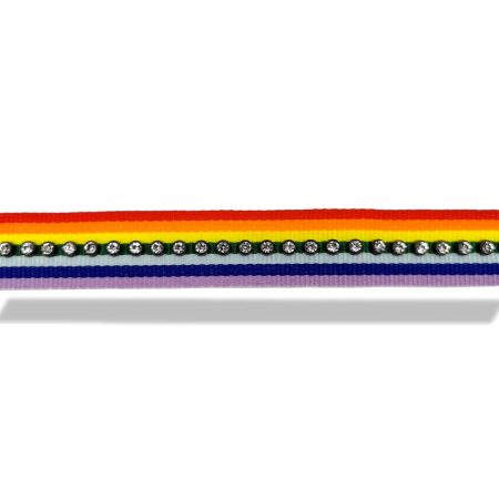 passamaneria realizzata in gros grain a righe orizzontali multicolor, centralmente vi sono applicati strass con ghiera termosal