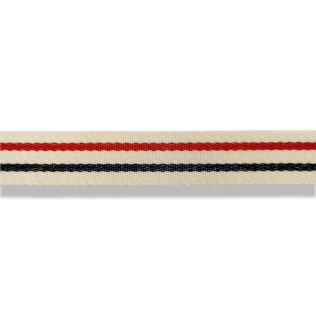 passamaneria realizzata in gros grain , fondo beige e righini centrali nero e rosso mm 25