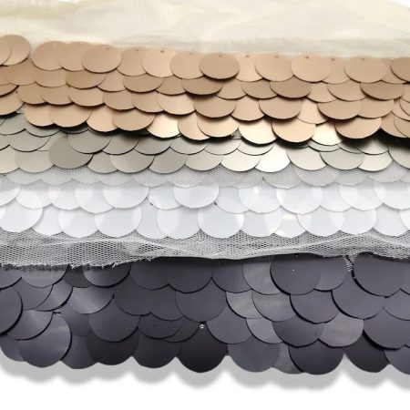 passamaneria realizzata su base di tulle con paillettes grandi e tonde, ricamate e disposte in file orizzontali mm 80