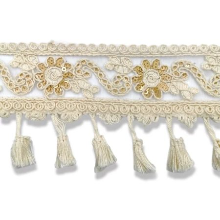 passamaneria realizzata su base di tulle bianco con ricamo centrale in filo di lana beige, con pompon pendenti cm 10
