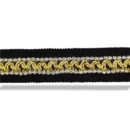 passamaneria realizzata su fondo nero con ricamo centrale in filo lurex oro e lateralmente con catene di strass crystal mm 25