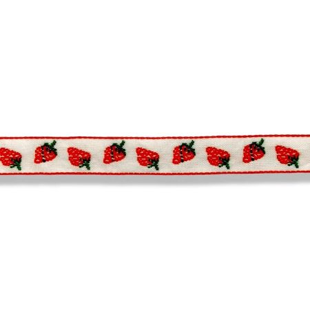 passamaneria realizzata su fondo bianco con ricami raffiguranti delle fragole mm 15