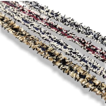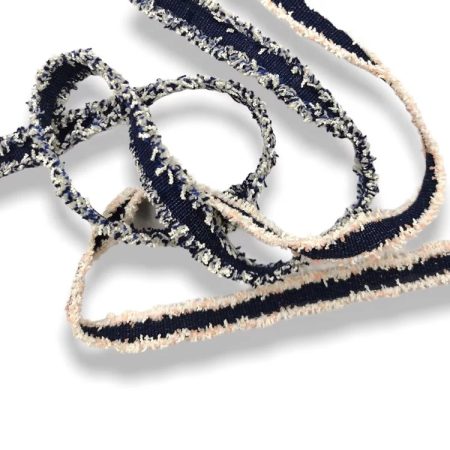 passamaneria sfrangiata realizzata centralmente con tessuto gros grain in tinta unita e lateralmente con frange colorate mm 25
