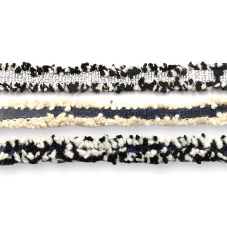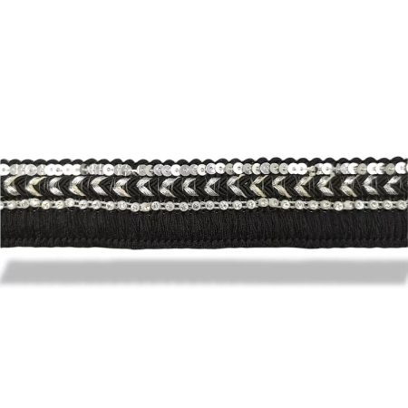 passamaneria sfrangiata con fili glitterati, con stampa bianca su bandina centrale, realizzata con fili neri e glitterati mm 42