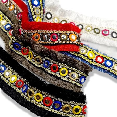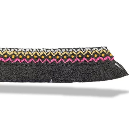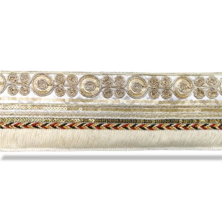 passamaneria sfrangiata in stile etnico, realizzata con bandina superiore, avente ricamo a rilievo mm 25