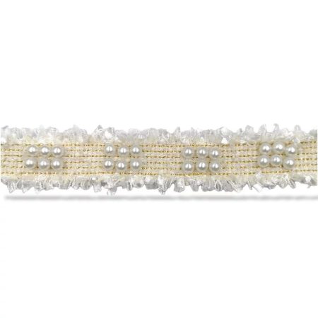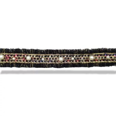 passamaneria sfrangiata con bandina centrale ricamata in filo e inserti in lurex oro, e con perle mm 30