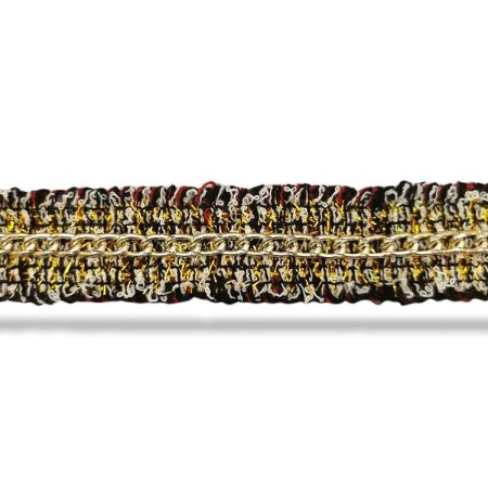 passamaneria sfrangiata con inserti in filo in lurex oro e catenella dorata centrale mm 30