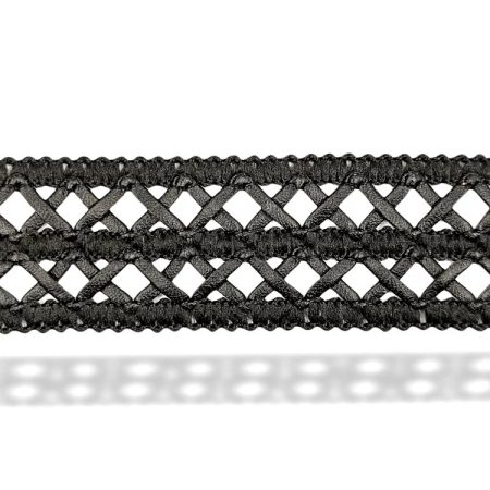 passamaneria traforata, realizzata centralmente con materiale in eco-pelle e ai lati con ricamo in filo mm 30